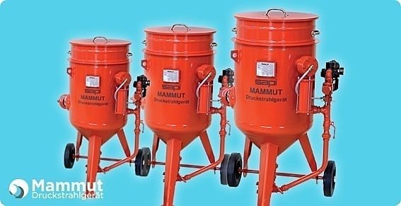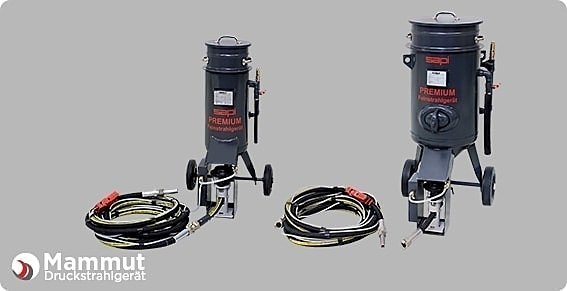 Az alábbiakban a TÜV által bevizsgált „Mammut” sorozatú nyomóhomokszóró berendezéseink különböző kiviteleit és méreteit találja. Az itt felsorolt összes homokszóró készülék fokozatmentesen állítható nyomásszabályozóval és vízleválasztóval van felszerelve. A szórónyomás – a választott leállítási rendszertől függetlenül – fokozatmentesen, 0,1 és 12 bar között szabályozható. Ennek köszönhetően a SAPI nyomóhomokszóró berendezés nemcsak magas nyomású alkalmazásokhoz alkalmas, hanem univerzálisan használható közepes és alacsony szórónyomásokkal történő homokszóráshoz is.