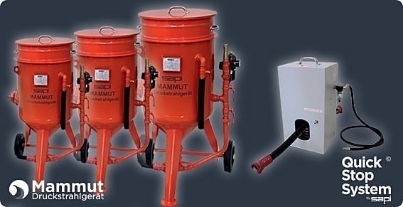 A jól bevált SAPI gyorsleállító rendszerrel való homokszórás során a szórótartály folyamatosan nyomás alatt marad. Így a nyomáskapcsoló kar megnyomásakor a beállított szórónyomás azonnal a szórófejen jelentkezik, ami az összes többi leállítórendszerhez képest jelentős szóróanyag-megtakarítást eredményez. Emellett a levegőfogyasztás is csökken.